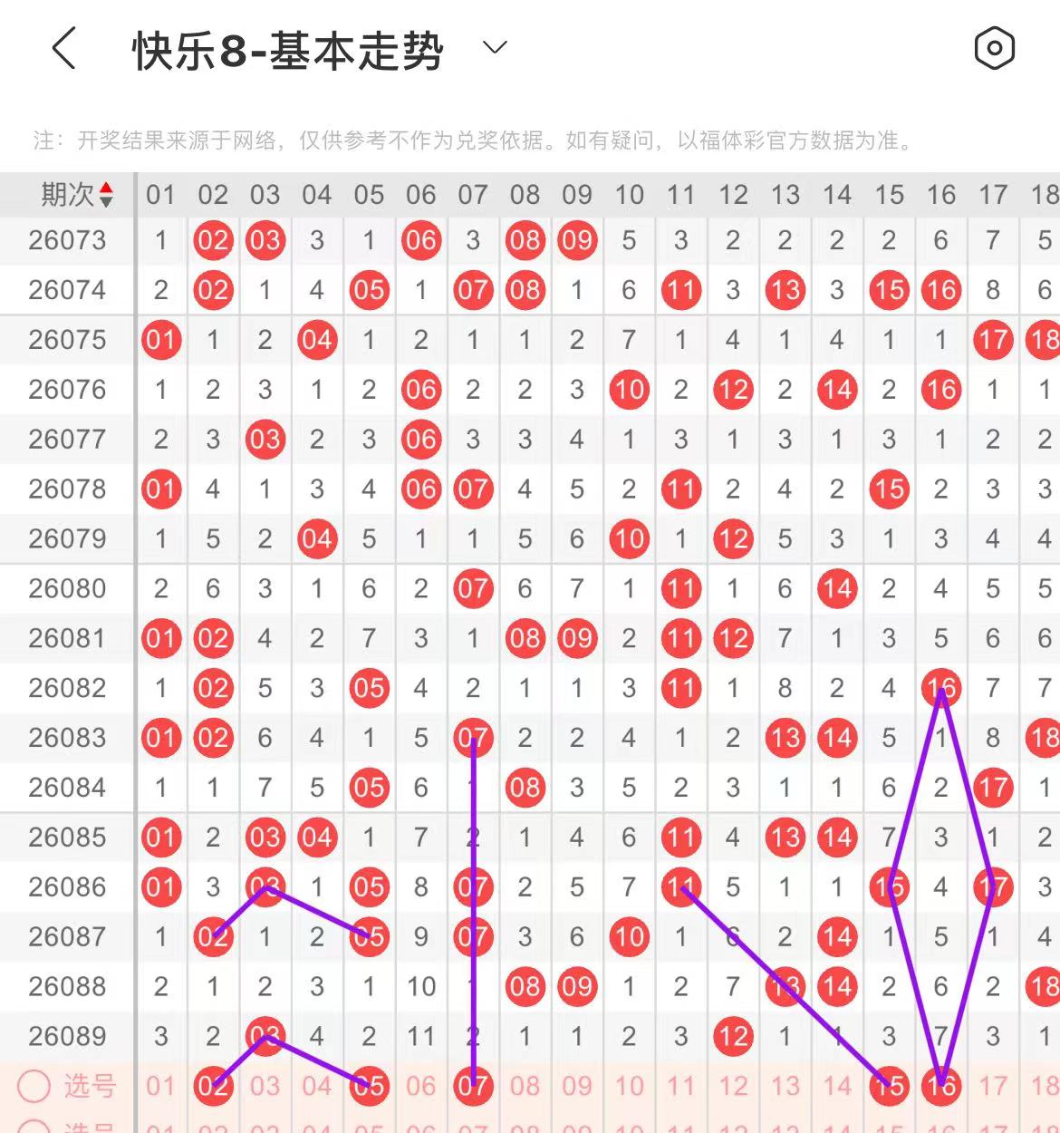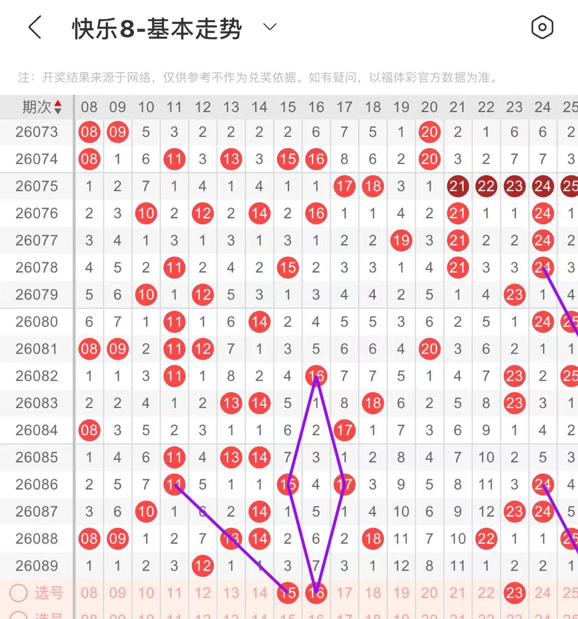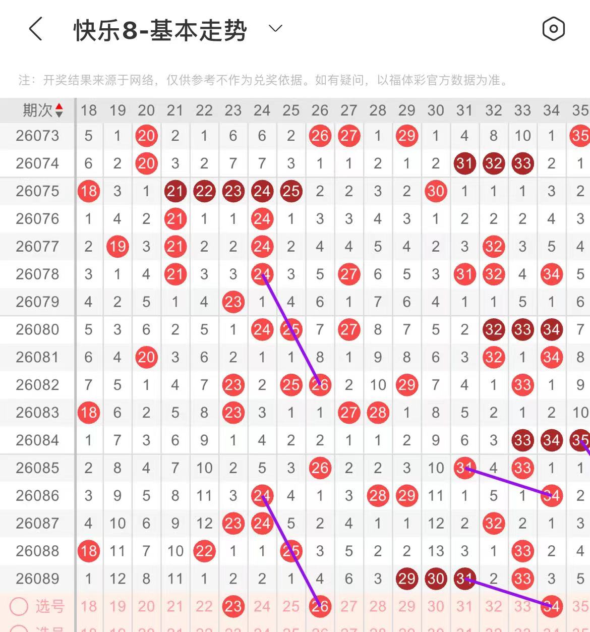 21-30区:本区间上期开出了两个号码,从号码走势图上看,本期注意前半区号码回补,出号个数在两个号码左右,有出号走势的的号码有26号,斜连出号走势,防23.26同出。
