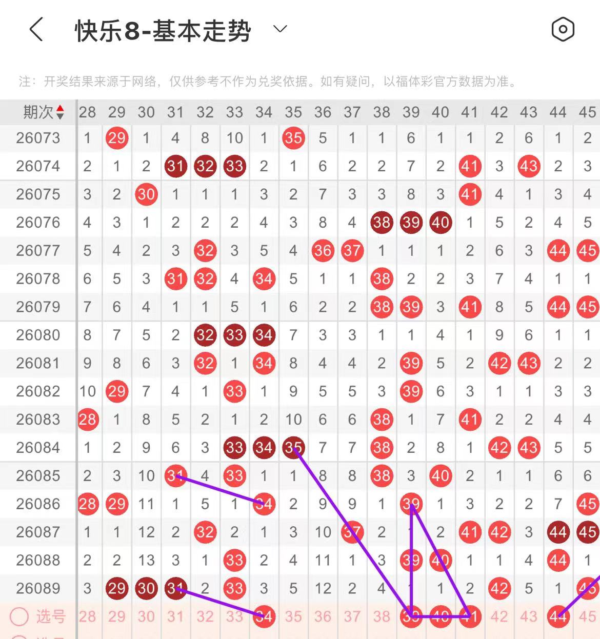 31-40区:本区间上期开出了两个号码,从号码走势图上看,该区现属于温热区,出号个数应该还能保持在三个号码左右,有出号走势的的号码有34号,做为边号开出,39号,斜连出号走势,防39.40同出的可能。