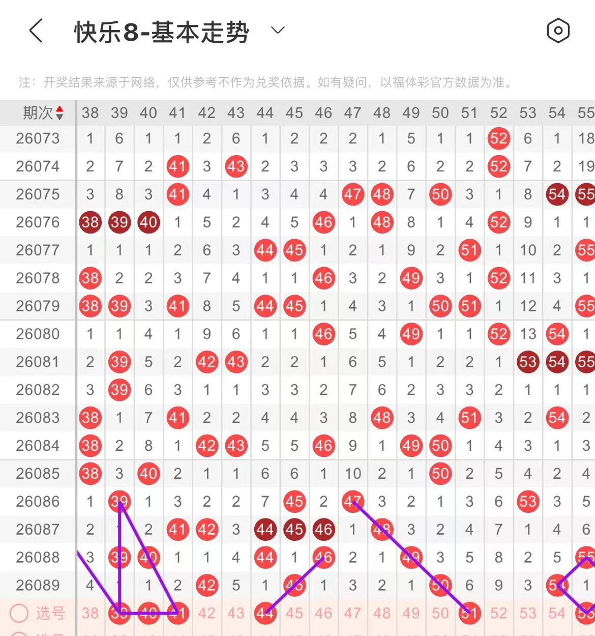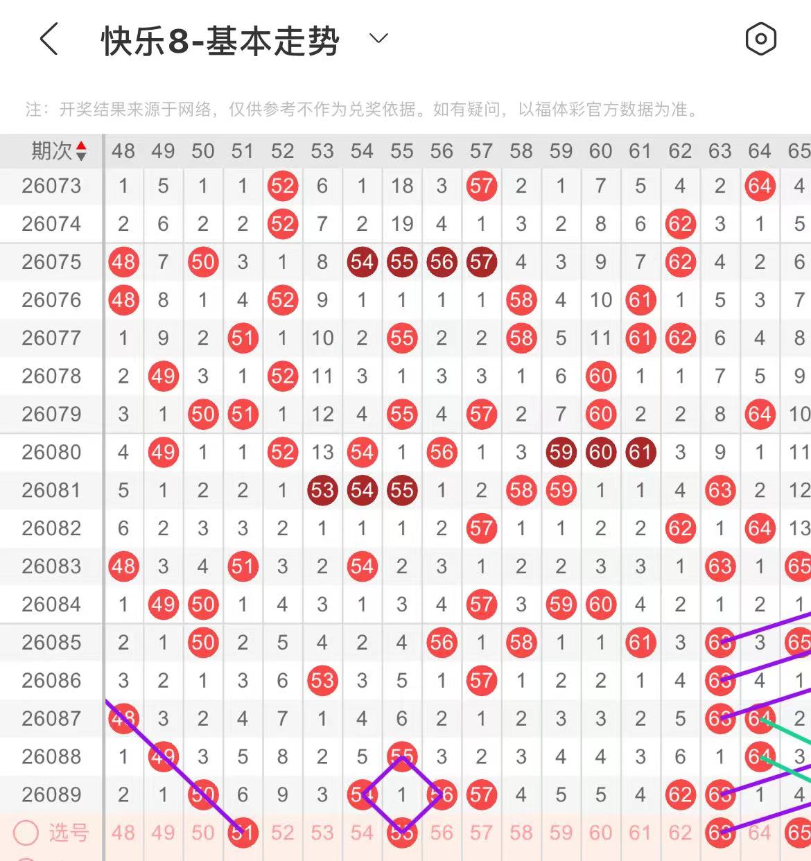 51-60区:本区间上期开出了三个号码,从号码走势图上看,该区号码走势有回暖的趋势,出号个数在两个号码左右,有出号走势的号码有51号,斜连出号走势,55号,形成一个菱形走势形态。