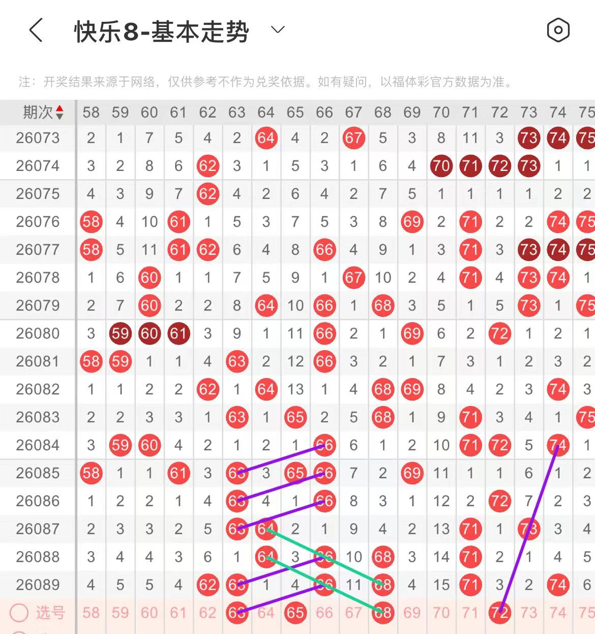 61-70区:本区间上期开出了四个号码,从号码走势图上看,该区现属于热号区,出号个数还能保持在三个号码左右,有出号走势的号码有63号,66对应63出号走势,防63.65同出,68号,平行斜连出号走势。