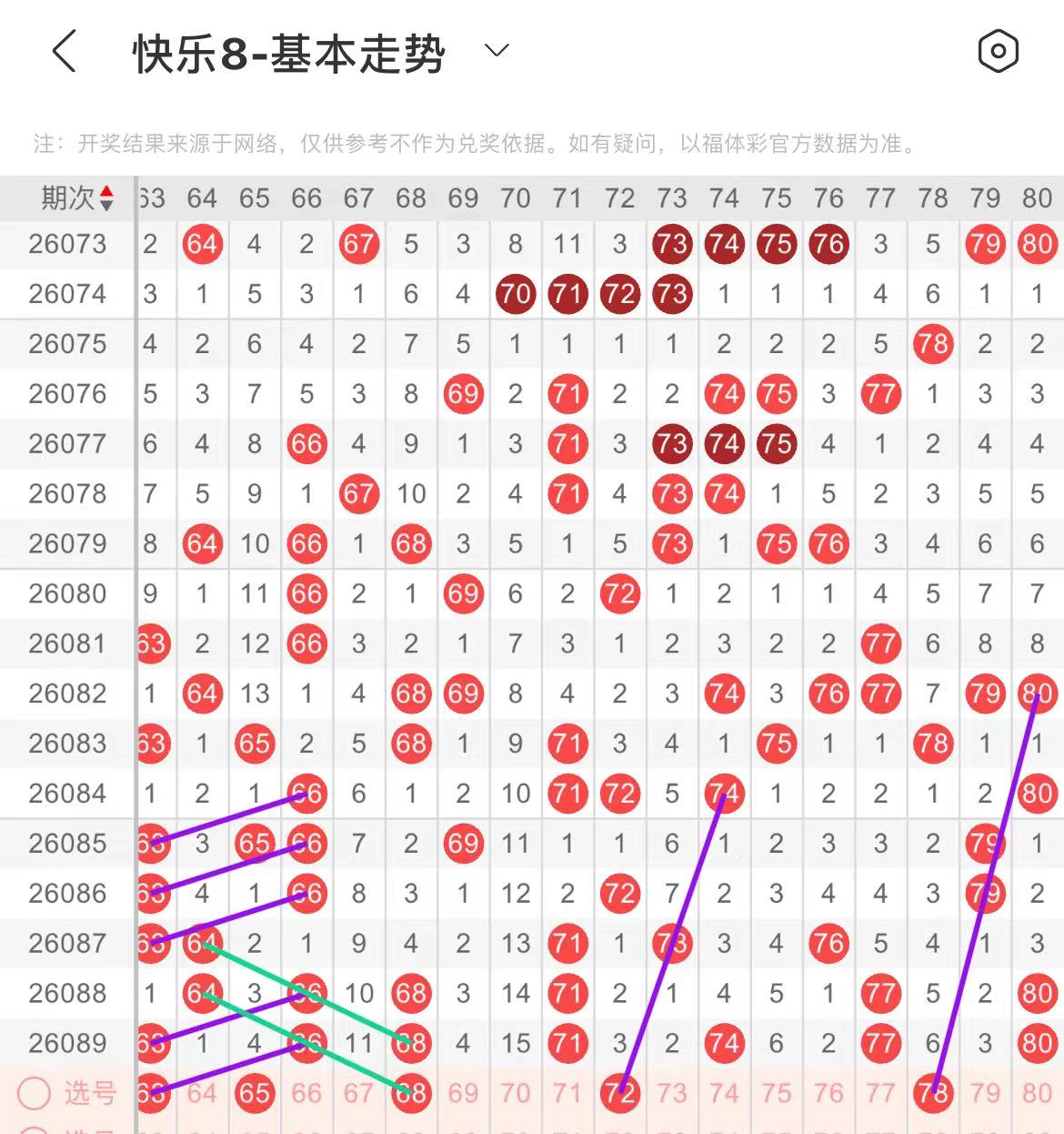71-80区:本区间上期开出了四个号码,从号码走势图上看,本期可参考的号码走势甚少,注意出号个数有所减少,有出号走势的号码有72.78号,均有斜连出号走势。