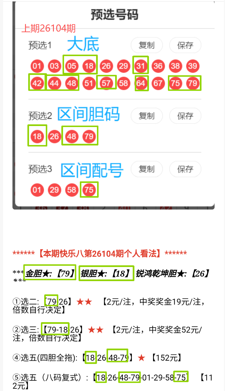 ★★★快乐8第26104期中金胆银胆,四胆全拖中三,选五复八中四,大底20个中10个★★★