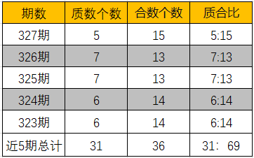 本期观点:合数优势巨大且上期(327期)达到近期峰值(15个)。根据“冷热转换”的规律,质数在持续弱势后,本期回补可能性显著增加。可重点留意冷质数的开出。