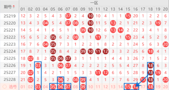 该区间03号数字我们注意一下出号情况,本期可以防守一下03 06号数字同出的情况。上期开出了连号空一带号06 08 09号数字,本期我们注意一下出一个重号的情况,其中的06 09号数字我们可以重点关注一下。本期的11 12号数字我们注意落下一个号码的情况,其中的11号数字我们可以重点关注一下出号情况。本期的13 14 15 16号数字我们注意出一个号码的情况,其中的15 16号数字可以重点关注一下。本期的18号数字我们防守一下出现四重的情况。