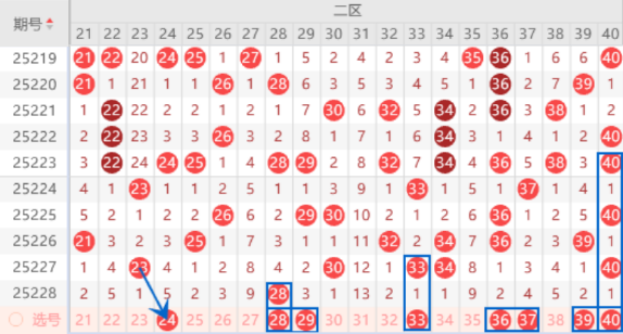 该区间的24号数字我们防守一下出号情况,本期可以防守一下24 36号数字同出的情况。本期的29号数字出号机会是有的,我们可以关注一下,本期可以防守一下29 33号数字同出的情况。本期的30 33 34 40号数字都是属于空一期的号码,本期我们注意落下号码的情况,其中的33 40号数字我们可以重点关注一下。本期的39号数字我们注意一下出号情况,属于三斜连号码,出号机会是有的,本期可以防守一下27 39号数字同出的情况。