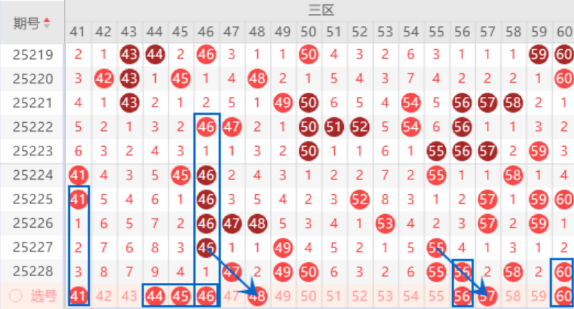 该区间的41号数字我们注意一下出号情况,本期可以防守一下41 45号数字同出的情况。本期的42 43 44号数字我们注意出一个号码的情况,属于重号43号数字的边号回补号码,其中的44号数字我们可以重点关注一下。该区间上期开出了47 49 50 55 56 58 60号数字,本期我们注意一下出重号的情况,其中的56 58 60号数字我们注意一下出号情况,该区间的夹号48 57 59号数字我们也是要注意出号情况的,其中的48 57号数字可以重点关注一下。