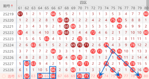 该区间的62 63号数字我们注意落下一个号码的情况,其中的62号数字可以防守一下。本期的66号数字我们注意一下出重号的情况,本期可以防守一下66 70号数字同出的情况。本期的70 71 74 77号数字我们也是要注意落下一个号码的情况,其中的70 71号数字可以重点关注一下出号情况。本期的73号数字是属于三斜连号码,出号机会是有的,我们可以关注一下。本期的76号数字是属于对应斜连号码,出号机会也是有的,我们可以防守一下76 79号数字同出的情况。