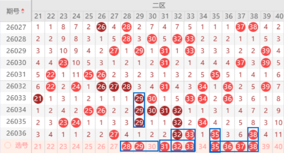 该区间28 29 30号数字是属于重号29号数字的回补号码,本期我们注意一下出一个号码的情况,其中的28 29号数字可以重点关注一下出号情况。上期开出了连号空一带号32 33 35号数字,本期我们注意一下出重号的情况,其中的32 33号数字可以重点关注一下。本期的36号数字是属于三斜连,可以关注一下出号情况。本期的37号数字出号机会也是有的,属于跟随号码,可以防守一下37 38号数字同出的情况。