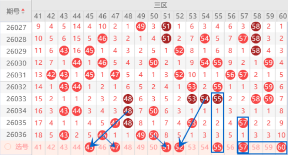 该区间的45号数字是属于四斜连号码,出号机会也是有的,我们可以防守一下45 46号数字同出的情况。本期的47号数字我们防守一下出号情况,本期出号机会是有的。本期的49 50号数字我们也是要注意出一个重号的情况,其中的50号数字可以重点关注一下,本期可以防守一下50 51号数字同出的情况。本期的54 55号数字我们注意落下一个号码的情况,可以防守一下55号数字出号情况。本期的57号数字可以防守一下出号情况,本期有可能57 60号数字同出的。