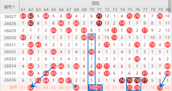 该区间的62号数字我们注意一下出号情况,属于四斜连号码,出号机会是有的。本期的68号数字出号机会也是有的,70号数字是属于121走势,71号数字是属于跟随号码,所有本期我们可以防守一下68 70号数字或者68 71号数字同出的情况。上期开出了74 75 76 77号数字的四连号,本期我们注意一下出一个重号的情况,其中的75 76号数字可以重点关注一下出重号的情况。本期的79号数字我们防守一下出号情况,本期可以防守一下61 79号数字同出的情况。