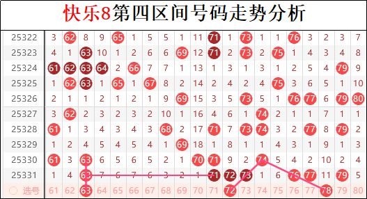 四区上一期号码持续走热,由原来的一码转变为五码,上一期直接升级七码走势,尤其是三连码在重号中现身,且为四斜连走势的下拉,这也导致形态在四区升级。本期四区需警惕热度回调风险,七码集中释放后易现短期饱和,需防范回撤至三至四码的正常值区间。同时注意三连码末端68是否存在惯性延伸,68若再出需防与65或66形成隔期呼应的短连结构。目前四区点位前半部分少码,后半部分多码,不排除出现前后互换的走势。后半段75以上号码积累过热,存在回调压力,而61-70区间沉寂多期或借机轮动反扑。重点关注61-65段的低位回补机会,尤其62、63在遗漏超阈值后已现聚集信号。62与63若同步回补,或将带动61-65区块形成小范围连码反弹。