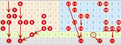 在上期中1-10号数字区间只开出了一个数字,456这三个数字落了一个号,上期思路没错,这期应该还是要落一个号,比较看好4号数字,4号数字又是对称类型,所以预出几率还是大的.再来看17号数字。16号数字已经有8期没出号了,属于冷号一类,选号要尽量避开冷号,选他的零号,所以先定17号数字吧。上图中18 、19、20号这三个数字在上期没有落号,这期必定要落一个号,比较看好19号数字。