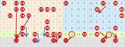 上图中23号数字也是对称类型,属于重号类型的对称,24号数字又是热号数字,会不会带动23号数字出现呢?上图中可以看到26号数字左右两边都是重号,这期26号数字会不会出重号呢?我还是比较看好的。28 29 30这个连号这期会不会落号呢?还是选一个做防号吧,31-40号数字区间有转热趋势,我们就先重冷号的邻号着手吧,比较看好31 37 39这三个数字。
