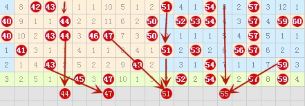 上图中44号数字也是属于对称类型中的一种,它的邻号43号数字也是对称类型的一种,这里比较看好44号数字。51-60号数字区间一直都是热区,没有转冷的趋势,所以可以多选几个号,本期比较看好51 55号数字,说实话这个区间的对称类型的号有点多,有点难取舍。就先定这几个吧。