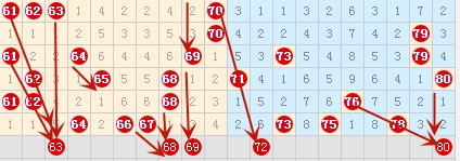 前几期都再说66 67要落号,上期终于两个的落下来,不用追了。先来看63号数字,属于对称类型,斜3连形态有比较多。还是比较看好的。66 67这个2连号这期应该不会落号,那我们就选他的邻号68 69号数字,我比较看好69号数字。71-80这个区间有点不好选号,上期冷号的邻号都跑出来了,这期就避开冷号和冷号的邻号来选号吧,比较看好72 80这两个号。
