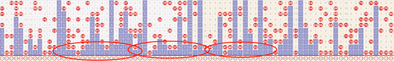第一我们常讲的追热不追冷,既然后区大号成串出现,且在四期之前依然是最热门的号码,那我们就紧紧跟进热门号码,将当期一半号码看在后区大数上,根据走势判断下期的方向。判断依据依然按照咱们之前的重号连号斜连号来判断,另外再加上区间内统计号码次数出现最多的作为必选胆码,这是追热必备防守。