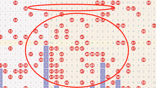第二看前面断区,依照分析,后区大号热后前面必然会热,但是36-50这个区间仅仅热了一期就凉凉了,221期只出了一个号码。当期按照八个区间计算,号码最热的依次是第一,第七,第八三个区间。按照冷热交替分析,下一期我们应该将重点放在2,3,4,5区间上。尤其36-50这个区间,不太可能只蹭一下热度就跑。在遗漏最多的区间,又是冷门,那么老赫坚信冷到极致就一定发光发热,所以2022222期我依然重点防守此区域,而且必须用至少两连号进行作胆,用31 32和42 43来进行防守。
