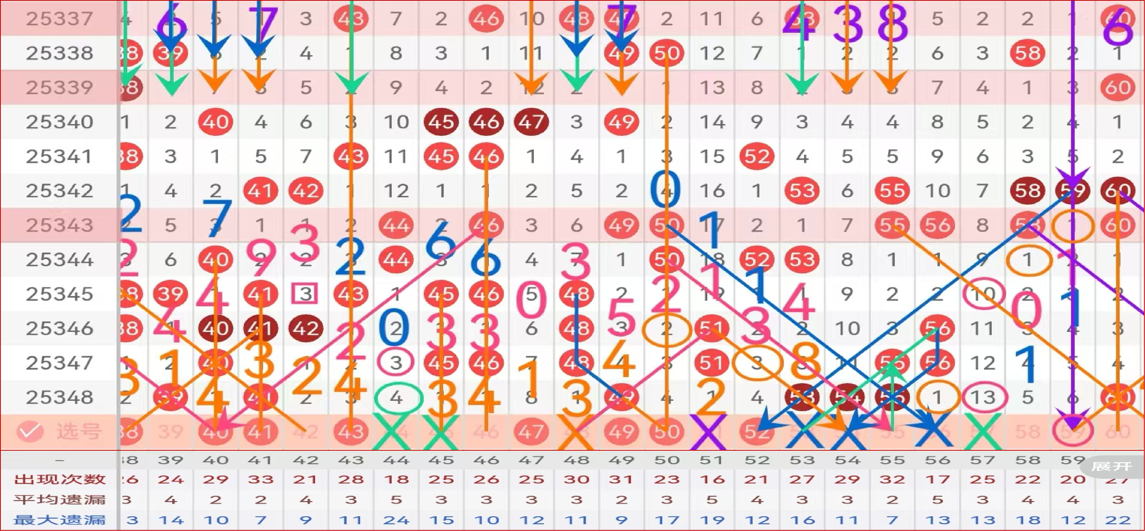 三区间推荐主做号码:41 43 47 49 50 52;防守号码:42 46 55 58 60;