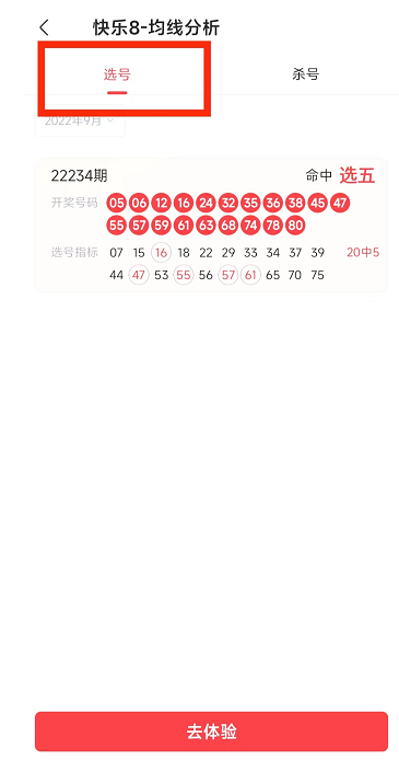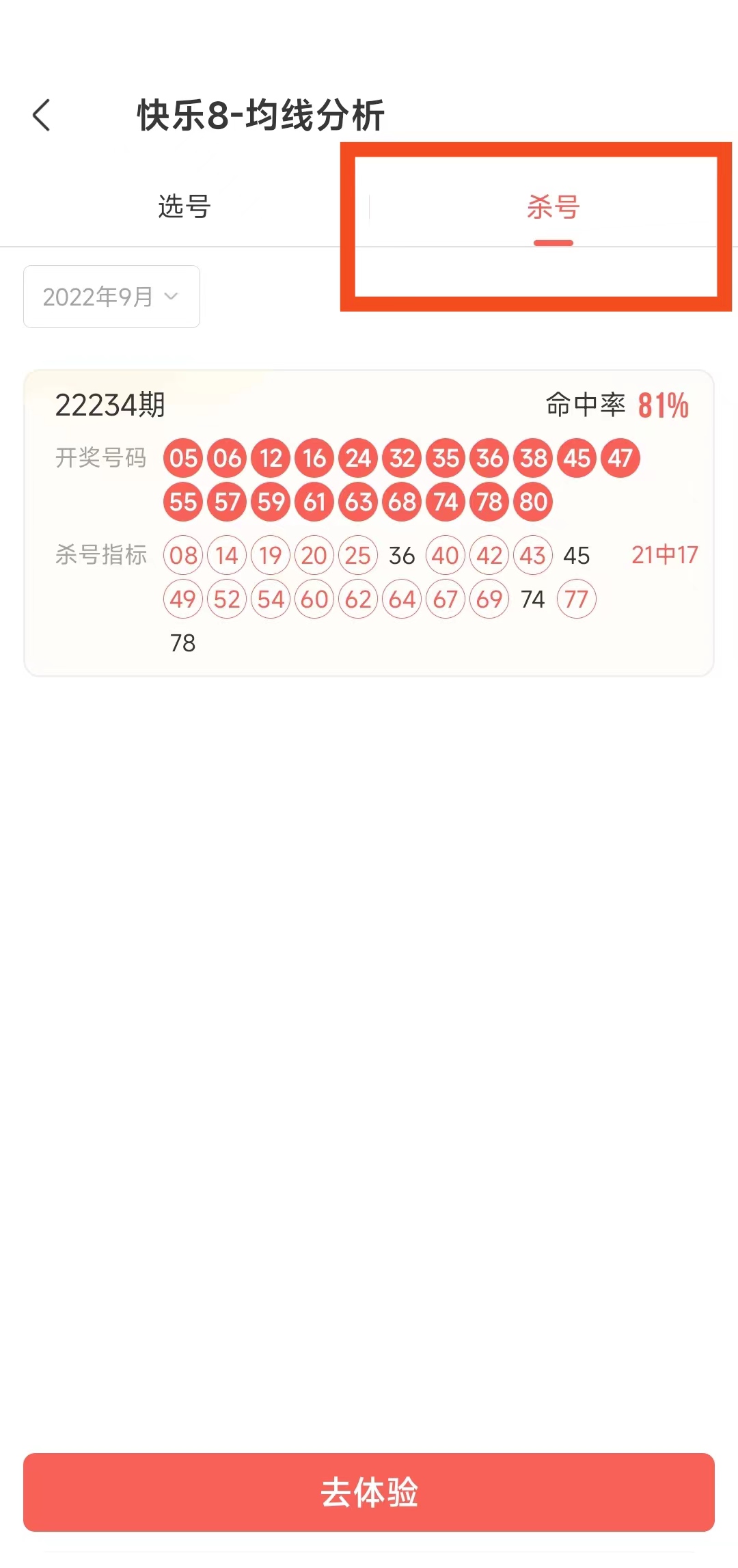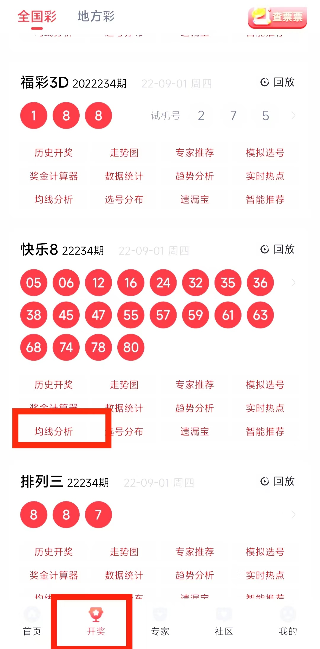 首先给大家展示完整版的均线分析工具打开方式。首先打开APP,点击底部的开奖,进入到快乐八界面,点击快乐八下方的均线分析工具,进入以后大家会看到选号和杀号工具,由于均线分析以杀号为主体,大家首先关注杀号一项。这个时候可以点击顶部的本月累计命中率查看往期的结果,里面包含了每一期杀号结果和选号结果。下面附图就是完整的步骤。