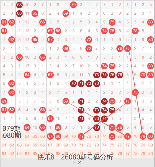 回顾26079期开奖号码:04 10 12 23 38 39 41 44 45 50 51 55 57 60 64 66 68 73 75 76   ,最近一段时间号码爆区几率特别高,目前已经连续多次出现爆区热开的情况,爆区之后基本上都是迅速回调,转换至其他区间继续暴热,大家若是能抓准区间,或许有很大的机会,但是号码的变盘规律是非常的快,很难把握,个人建议谨慎选择,不要 盲目的去操作~~