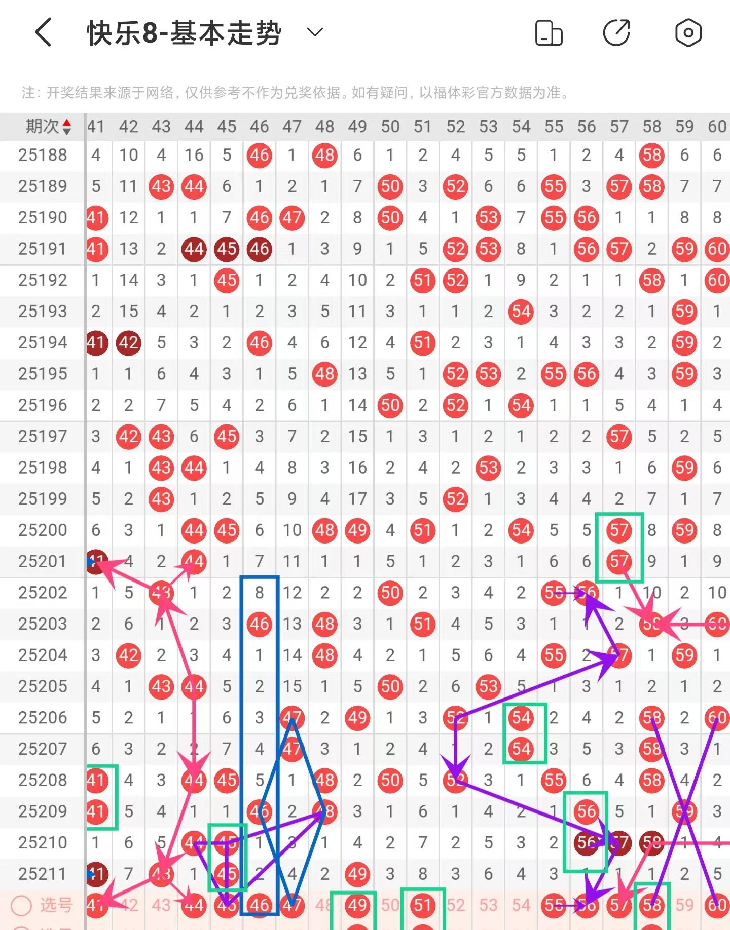 三区间上期稳定落号,一共开出四个号码球,本期考虑增加号码球的数量,以44号码球为对称走势起点,注意走势形态的41、44号码球,注意梅花形态的44号码球,防守百期相似形态的45号码球,注意隔期递减开出的46号码球,防守菱形形态的47号码球,阶梯落位重码走势注意关注49、51、58号码球,以52号码球为对称走势起点,注意走势形态的55、56号码球,以四区间的64号码球为对称走势起点,注意走势形态的57号码球,以59号码球为交叉中心点,注意分边落号的58、60号码球,期数增减法注意54、59号码球,因此三区间关注41-44-46-49-51-55-56-57-58-60。注意本区间的选二46-50、57-60。