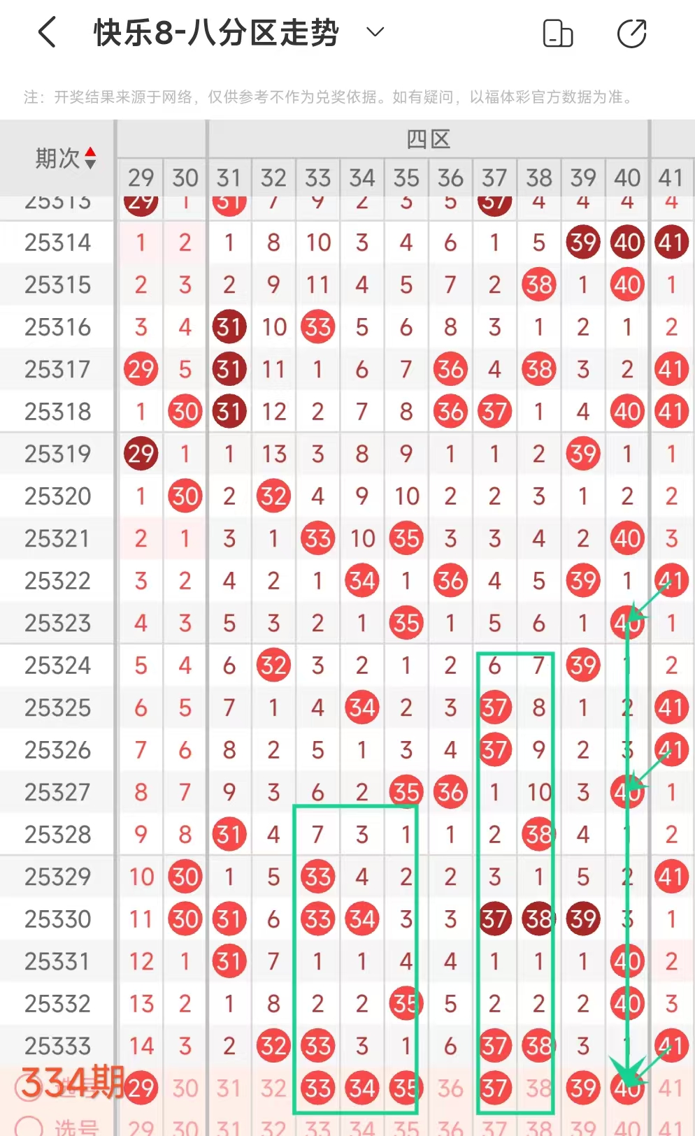 上期四区开出32 33 37 38这4个号码,本期考虑3个左右。