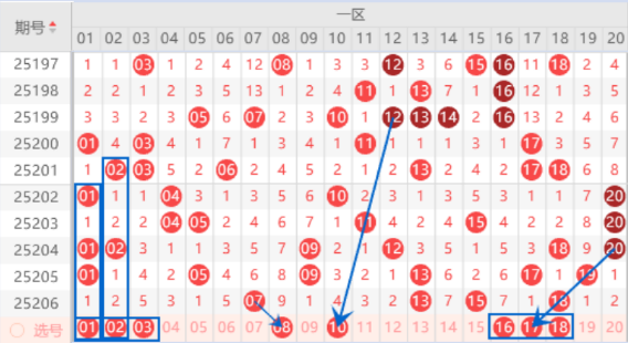 该区间的01 02 03号数字我们注意一下出号情况,本期的01号数字是属于空一对称号码,02号数字是属于空二对称号码,出一个号码的机会是比较大的,我们可以重点关注一下。本期的08 10号数字我们注意一下出号情况,这里可以防守一下同出的情况。本期的16 17号数字我们注意一下出一个号码的情况,属于区间出号,机会很大。本期的18号数字我们注意一下出重号的情况,本期可以防守一下17 18号数字同出的情况。