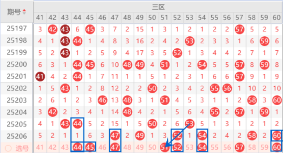 该区间的44号数字我们注意一下出号情况,本期可以防守一下44 45号数字同出的情况。该区间上期开出了47 49 52 54 58 60号数字,本期我们注意一下出重号的情况,其中的47 52 60号数字可以重点关注一下。本期的51号数字是属于三斜连号码,出号机会是有的,我们可以关注一下出号情况。本期的57号数字是属于空二对称号码,也是要防守一下出号情况,本期可以防守一下57 60号数字同出的情况。