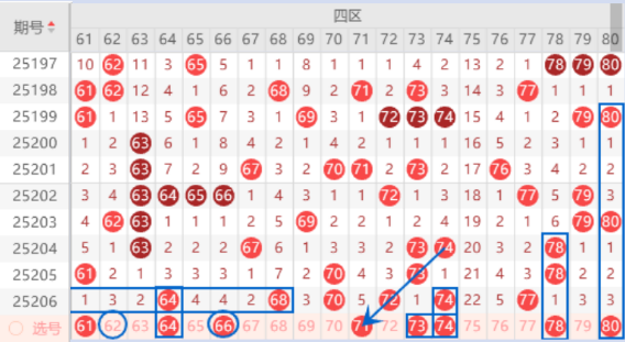 该区间的62 66号数字是属于空三中心号,本期我们注意出一个号码的情况,其中的66号数字我们可以重点关注一下,本期的61号数字我们也是要注意出号情况,所以本期的61 66号数字我们可以防守一下同出的情况。本期的71号数字是属于斜四连号码,本期我们防守一下出号情况,本期可以防守一下67 71号数字同出的情况。本期的73 78号数字我们注意出一个号码的,本期的73号数字是属于121走势,78号数字是属于161走势,出一个号码的机会很大,可以重点关注一下。