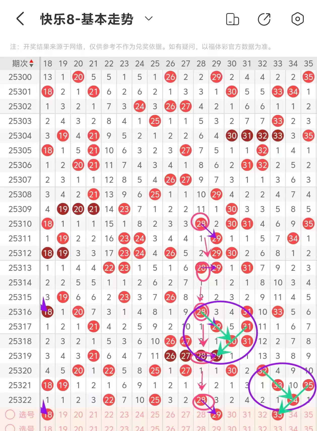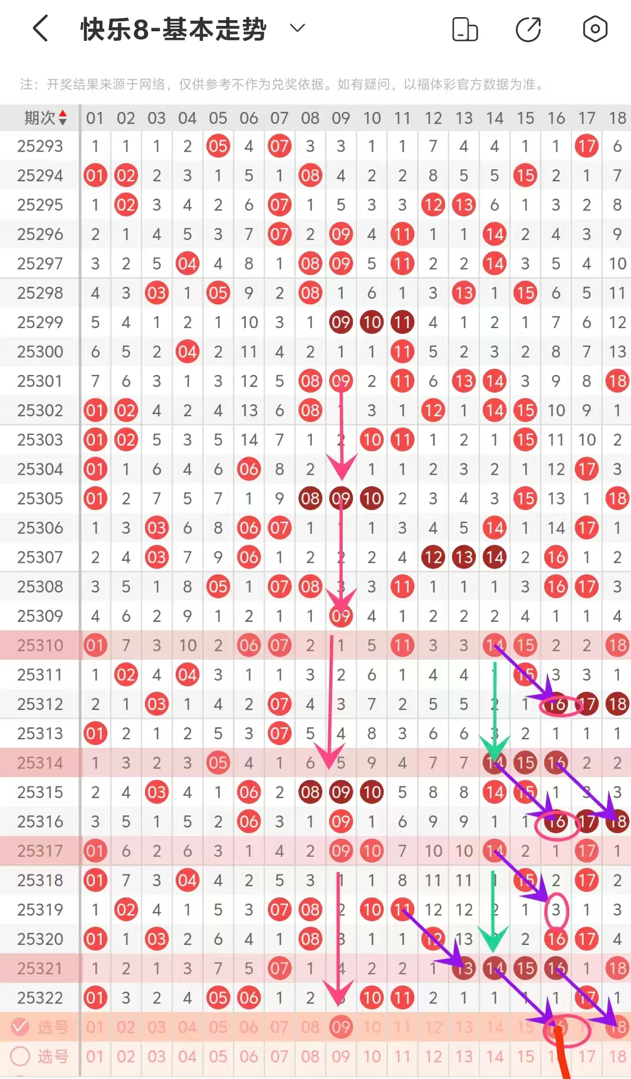 以上是第一次说所以说的很详细,后面我就直说画的箭头领域了,我们看第25310期的14,我有标记,它隔着3期后开了14,又是斜连开14,15,16,第25317的14隔着3期后又开了14,有斜连开趋势14,15,但16没来,所以在第25321期开了14后,隔着斜连的规律趋势选着16,如上图18,照14斜3连开后直3连开出18,按规律将在这一期连着16一起出,第一区域的选号就是09,16,18了