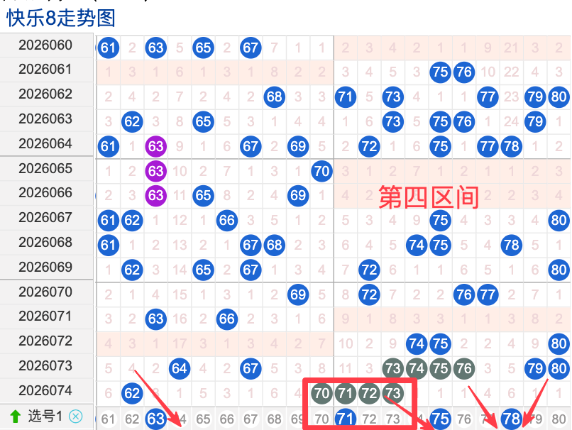 上期四区间开出了5个奖号(62.70.71.72.73)上期的四区开5个奖号呈现了一个递减趋势,开出的奖号1回补两码7回补4码,先来看号码63在近 30 期内属于还是很稳定的号码,近期出现频率相对,偶尔会间隔多期后出现一次,这个号码要注意防守,号码71具有一定的间歇性近期活跃度还不是很稳定比如有时会间隔35期就再次出现,有时会间隔多期,近期整体出现频率比较,近期还是要关注的.号码75活跃度近期比较,有一定的间歇性。活跃度近期较热,整体走势有一定的波动性.