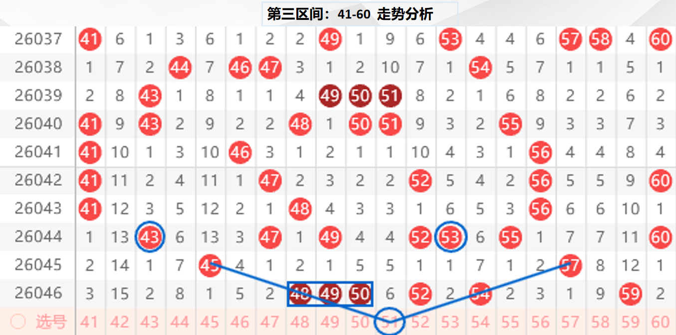 三区分析:【41-60】(走势图标注号码非小黄车大底,请谨慎参考,具体思路将在直播间分享讨论)