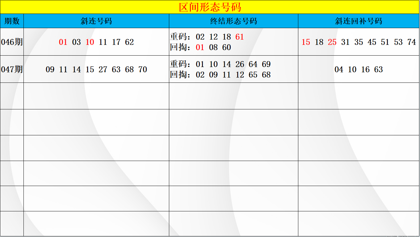上期三区再次中断形态,区间连续两期断形态,区间在两码开号断形态上与二区非常相似,在回补中本期要特别注意复制模式做重码的考虑重点,以区间在开号形态上判断,空位三连号的下方在重码的回补中要特别注意,在近期的空位三连号的开号形态中都会有重码的回补位置,形态回补优先侧重这里的布局选择。而在空位的三个孤码形态上本期也要特别注意在各个区间开出的类似出号模式,其中重码也是要重点关注,在四区和二区的三孤码出号中都是有重码的形态出现,同时还有分边和放空的对应位置,本期在52 54 59三码中也要同时注意判断一重一分一放的布局模式。从区间做空位中的回补重点考虑,接力周期的出号中本期还是要特别关注小周期上的回补出号,考虑重点以41 43 45 56 57五码中做优先的布局选择,特别注意在放空形态45 57的下方,以区间在两个孤码的形态放空后都会有至少一码下方的回补可能,本期可优先关注45 56 57三码中的出号机会,择一选择布局。