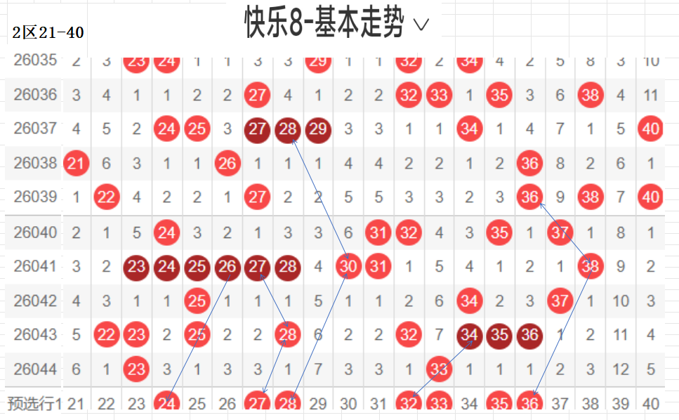 二区(21-40):遗漏5期以下有17个,0码23 33 2个,数据所示,冷码平均,选择条件增多了.上期开出了2个号码,出码比较集中.这期布防相应增加,重码按比例落这区较少,先给出关联码24,这个区间间接走势,温区,21-30区间上期开了1个,依旧不是重点选号区间,31-40区间开出1个,本期关注热码的回补,间隔小遗漏值最佳,3字头转热,这个小区热码注意回调,可以做关联码的布局,注重温冷码的回补.