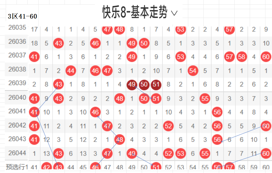 三区(41-60):遗漏5期以下有14码,0码43 47 49 52 53 55 60 7个,温开方式,这区码数有回暖之意,可以防一手,先定胆码走势较大者,隔期,斜三连,分边号码,可重防,间隔5期以上号码可以随走势选取,例如本期大冷码,走势比较大,可以做胆,通常联动可带出,分边对称的号码,本区间也有很大走势.可关注下.隐形夹角号码.做补位形态号码.都需要观察动态走势.以上是本区间的选码方法.