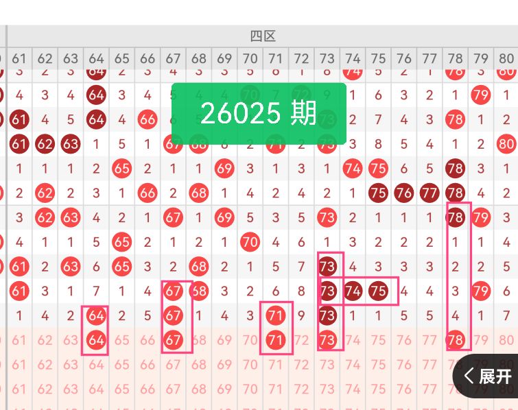 上期第四区间开奖4个号码,本期有望增加开出。64、67均为近期高频号,67在上期出现,近30期出现8次,属于高热号,64则是邻号补位,与67形成区间联动。71、73是四区的核心热号,73在上期及2026024期开奖中均有出现,稳定性极强,71近30期出现6次。78作为温号补位,近30期出现9次,能平衡四区的号码分布,避免过度集中在61-75区间。