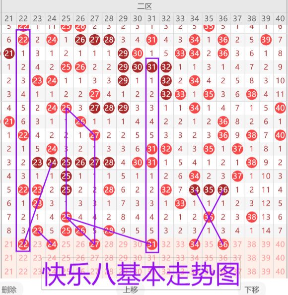 我们来看下二区的基本走势情况,上期开出了四枚开奖号码,本期预计开出4-5枚开奖号码,首先我们来看23的孤码开出考虑分边22 24,尤其注意22的对称形态。堵漏号码24 27同路双码建议二选一。31的遗漏五对称形态。34 36交叉走势建议二选一。