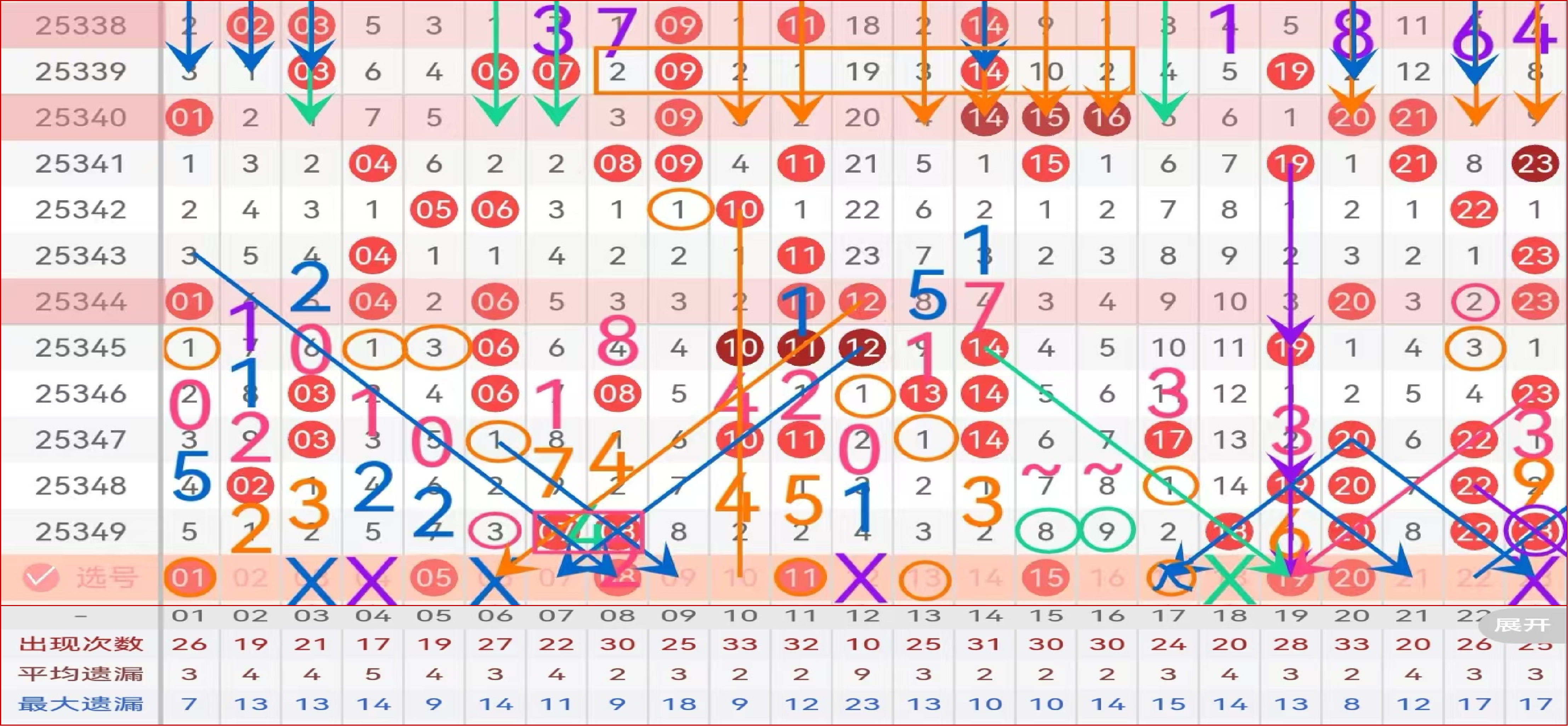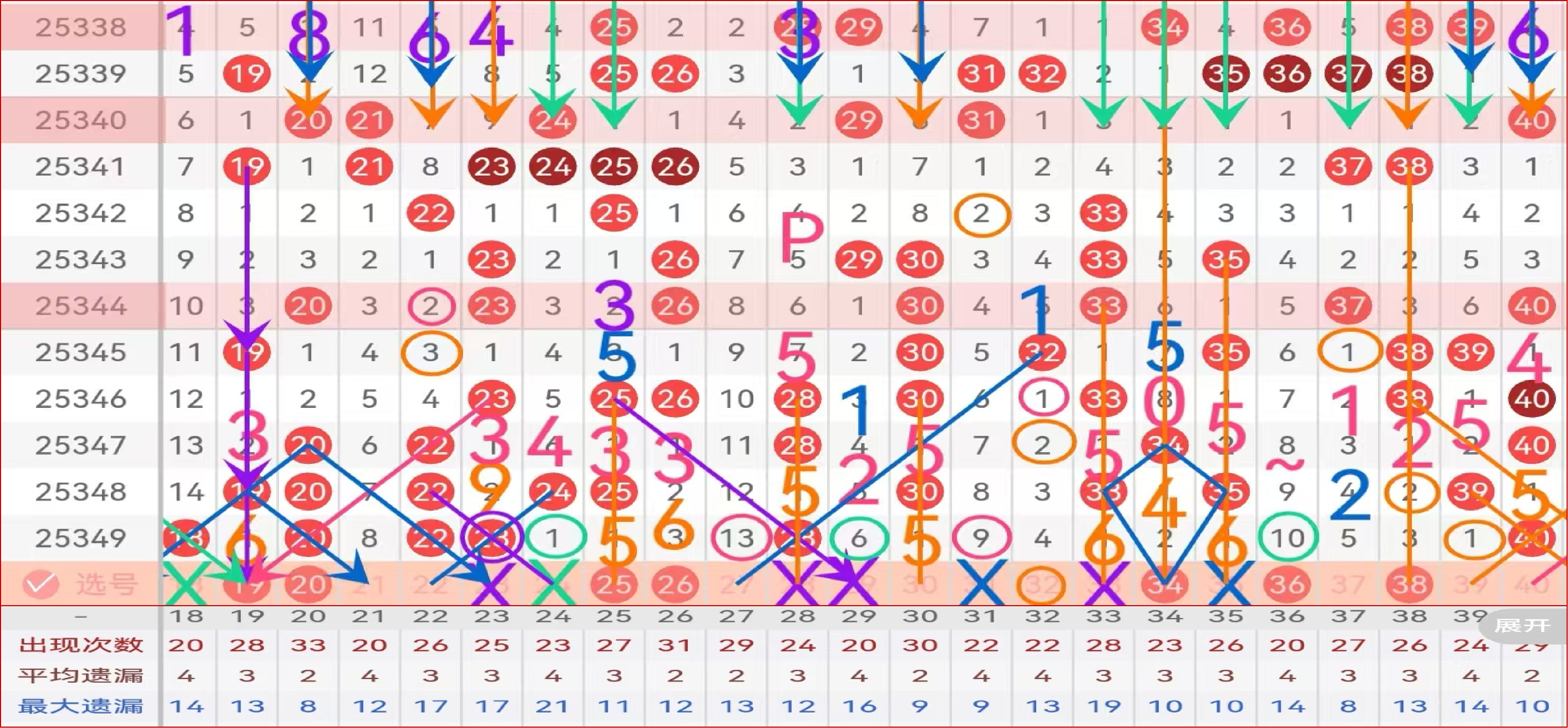 二区间推荐主做号码:25 26 34 36 38 防守号码:22 32 37 40;