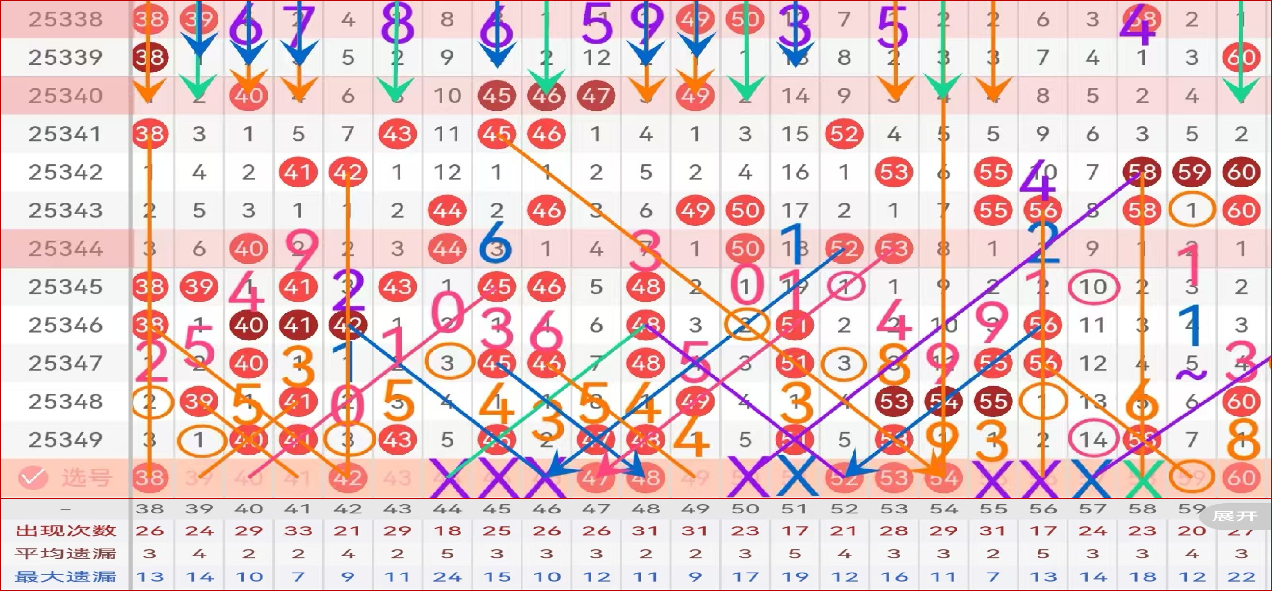 三区间推荐主做号码:42 47 48 52 53 54 60;防守号码:41 49 59;