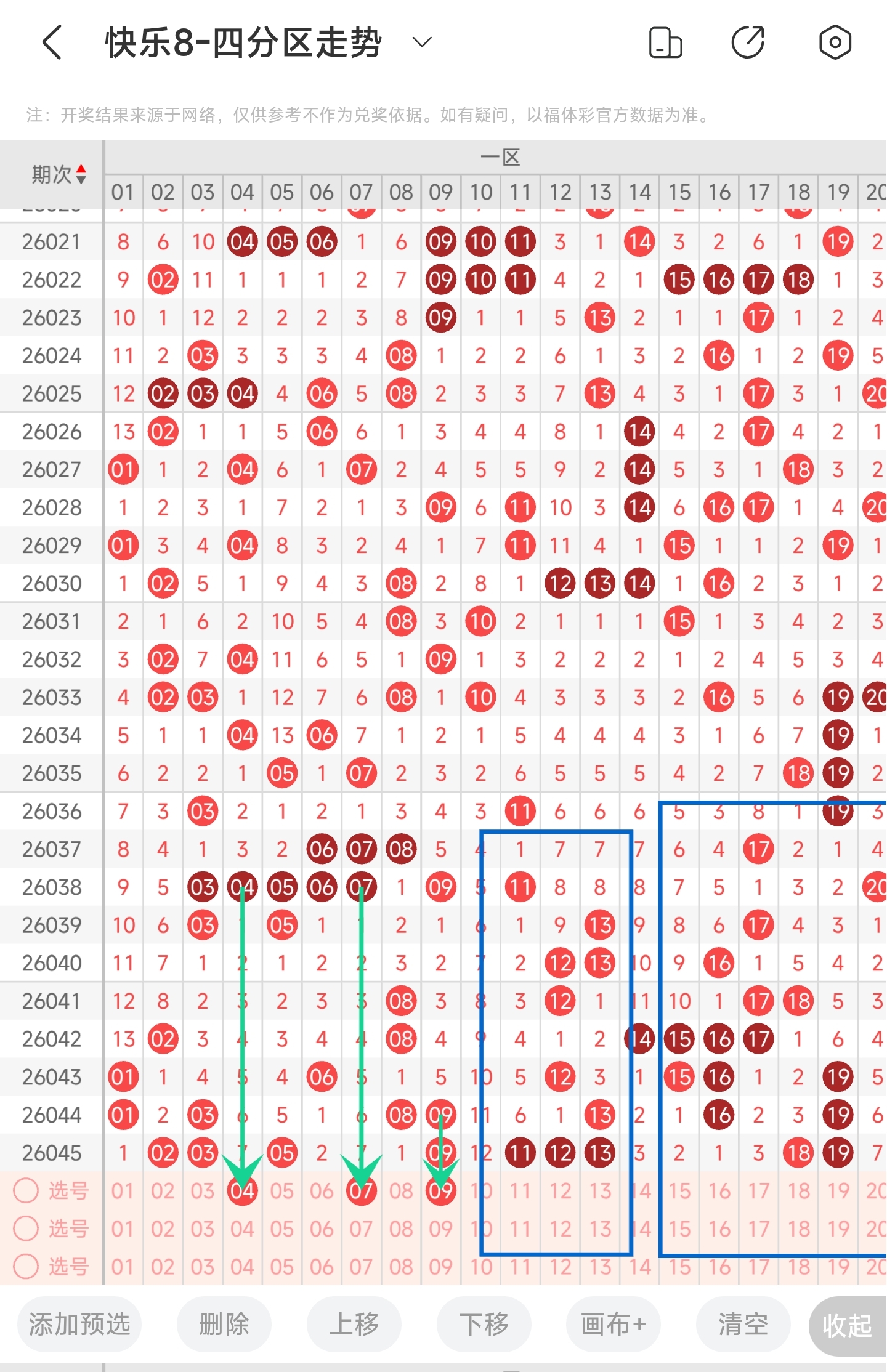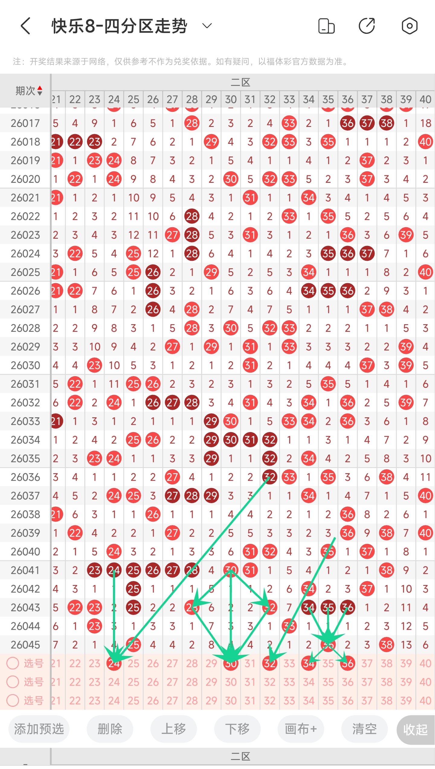 从近几期二区走势看,最近2期二区较为冷清的,本期可能会持续走冷,重心可以不放在二区;二区比较看好的号码有30-32,这两个号码,其中30号对称性很好,32号斜连线走势不错;此外比较看好的还有34-36;