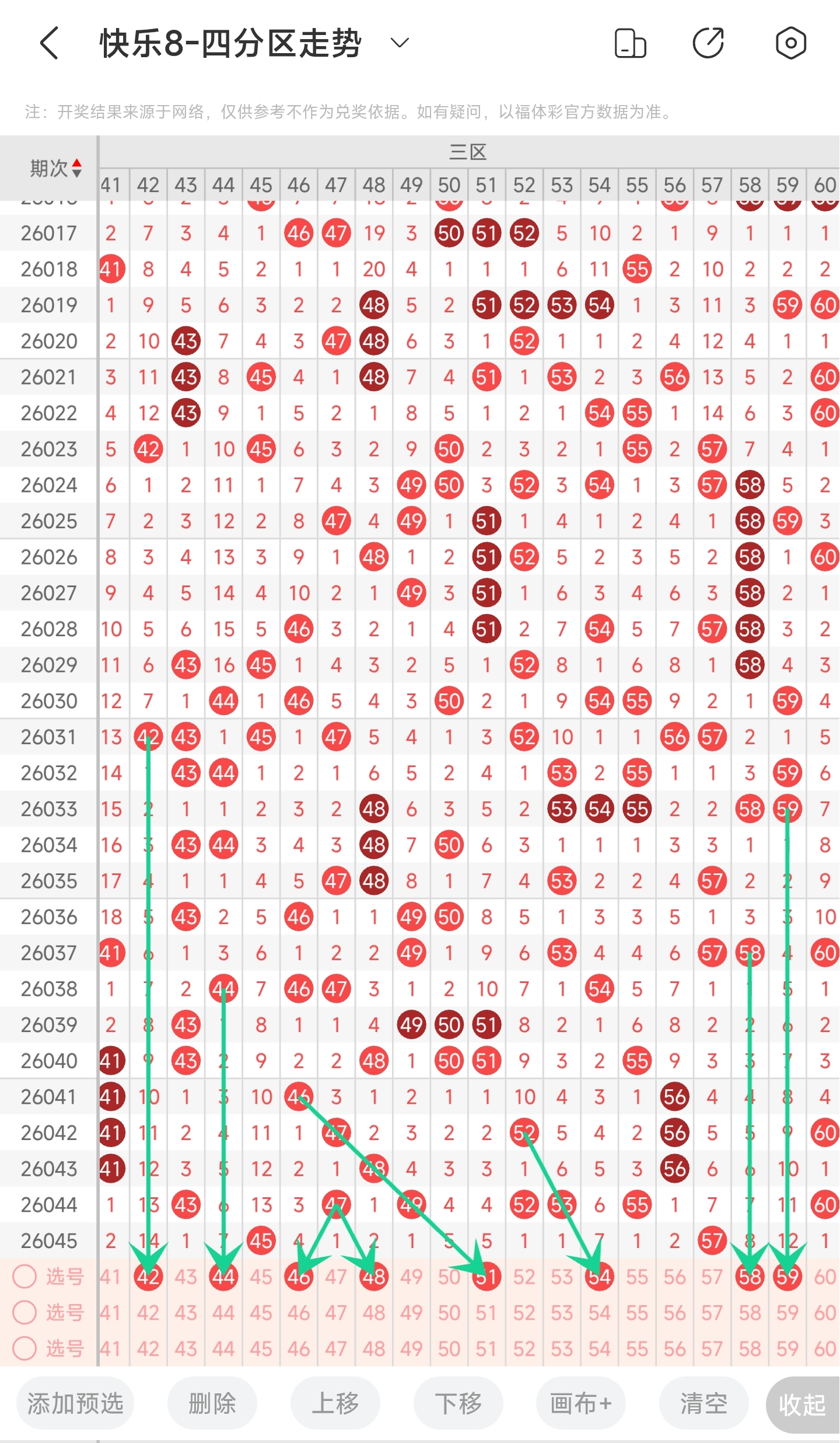 从近几期三区走势看,最近三区走势变化是比较频繁的,上期比较冷清,本期说不定就号码就会回补,要防备一下;三区从近期来看,连号和重号概率不是很高,所以可能关注一些遗漏比较久的号码,有42-44-46-58-59等号;