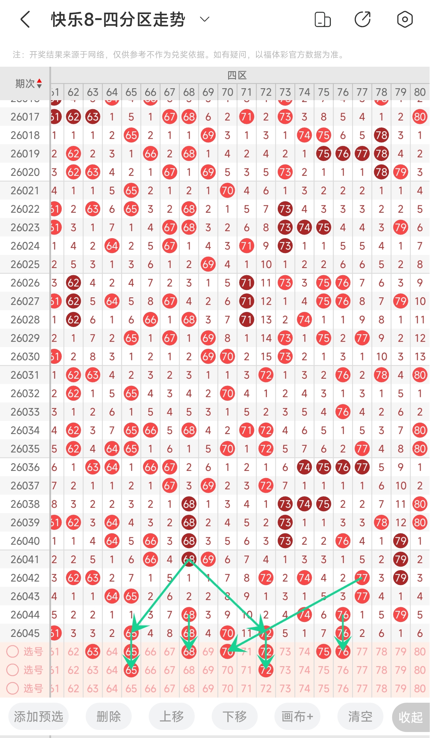 从近几期四区走势看,最近四区也是很热门的,本期可以比较重点关注;从四区整体走势看,连号概率不高,重号概率是比较高的,本期可以关注一下重号,特别是目前重号了一期的,可能会继续重号;从冷热情况看,不怎么看好冷号,比较看好热号和温号,比较看好的有63-65-68-70-75-76;