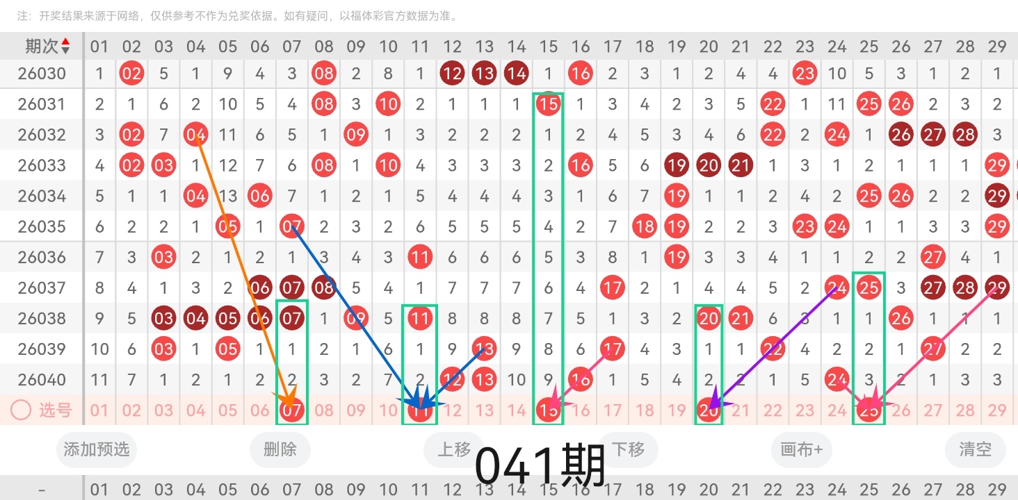 小梁根据上图中的画线思路走位分析:号码07与前几期开出的号码呈隔两期回补的走位且呈右斜四连的走势;号码11与前几期开出的号码呈两条左右斜三连的走势且呈隔两期回补的走位;号码15与前几期开出的号码呈隔九期回补的走位且呈左斜三连的走势;号码20与前几期开出的号码呈左斜三连的走势且呈隔两期回补的走位;号码25与前几期开出的号码呈隔三期回补的走位且呈左斜三连右斜连的走势。
