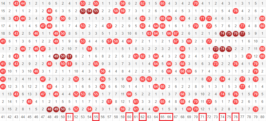 接下来我们一起看走势图,我们把01-40分为前区,41-80分为后区。
