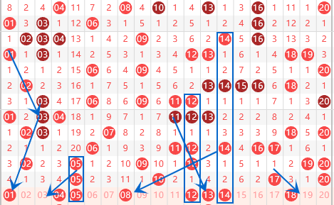 该区间的01号数字我们要注意一下,01 02 03斜连刚好对称,出号机会还是有的。本期的05号数字我们要注意走三重的机会,也可以防守一下04号数字出号情况。本期的08号数字是属于遗漏11期的号码,本期遗漏11期的号码有两个,我们做一下防守就可以了。本期的12号数字我们可以关注一下,是属于空一对称号码,出号机会还是有的。本期的18号数字是属于123走势,我们做一下防守就行了。