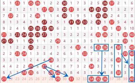 本期的连号21 22我们要注意落下号码的情况,重点考虑一下21号数字,他是属于三斜连号码,出号机会比较大。本期的28 29我们要注意出重号的情况,重点考虑一下21 29的出号情况。本期的31 37都是属于遗漏8期的号码,本期我们要注意出一个号码的情况。连号35 36我们也是要注意落下号码的情况,重点关注一下36号数字。40号数字也是空一对称号码,可以关注一下。