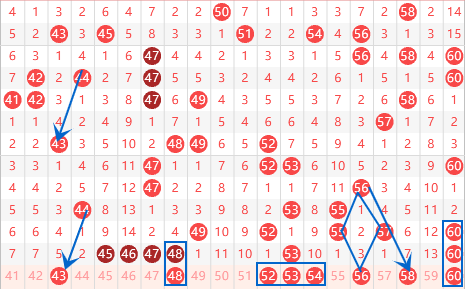 该区间的43号数字我们要注意一下,44空二期出43的情况近期比较频繁,我们可以防守一下。上期开出了4连号45 46 47 48号数字,本期我们要注意这里出重号的情况,重点关注一下48号数字,本期的54号数字我们要注意一下,是属于遗漏10期的号码,出号机会很大。56号数字是四边形号码,我们可以防守一下。本期的60号数字我们要注意出三重的情况。