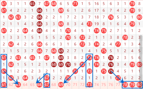 本期的61号数字是属于空一对称号码,本期我们可以防守一下。63号数字是属于V型号吗,本期我们要注意一下它的出号情况。本期的67号数字我们要注意出重号的情况。本期69号数字也是V型号吗,出号机会还是很大的,我们可以关注一下。连号空一带号73 75 76上期没能出重号,本期我们就考虑一下它落下一码的情况了。本期的78号数我们可以关注一下,是属于三斜连号码,出号机会很大。