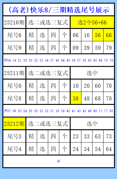 快乐8第212期图文(高老马),精选尾号展示
