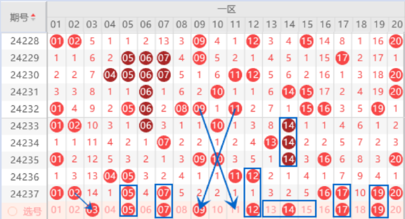 上期该区间开出了01 02 05 07号数字,本期我们注意一下出一个重号的情况,其中的01 02号数字我们注意出一个重号的情况,毕竟历史期数中,01 02号数字同出的时候都是有重号码的,所以可以关注一下。05 07号数字也是要注意出一个重号的情况,其中的07号数字我们可以重点关注一下出号情况。上期开出了16 17 19 20号数字,本期我们也是要注意出一个重号的情况,重点关注一下17 19号数字的出号情况。毕竟上期开出了07 17号数字,本期是有机会出一个重号的。